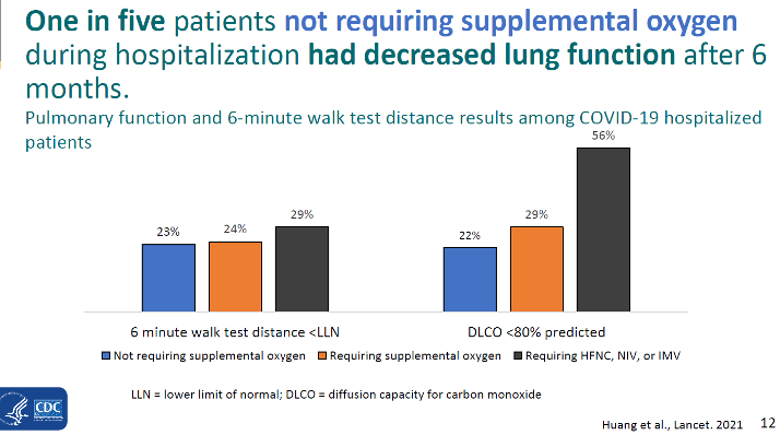 In a 6-month follow-up cohort study, Huang et al. followed 733 patients after hospital discharge. Those with more severe illness during hospital stay tended to have more severe impaired pulmonary diffusion capacities and abnormal chest imaging manifestation. Of additional concern, 1 in 5 patients who did not require supplemental oxygen during hospitalization had reduced lung function 6 months after "recovery."